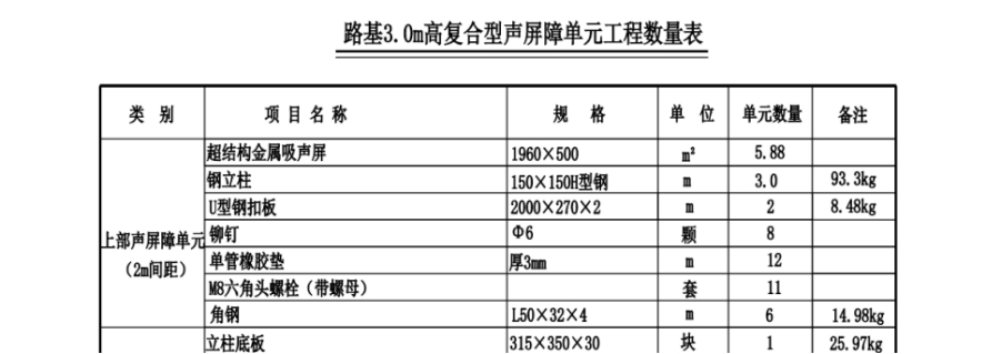 3.1.4.4B级普通螺栓:路基段复合型声屏障基础采用B级U型螺栓,其机械性能应符合《紧固件机械性能 螺栓、螺钉和螺柱》(GB/T3098.1-2010)中相关要求。配套螺母采用I型5级标准螺母(外六角),其机械性能应符合《紧固件机械性能 螺母》(GB/T3098.2-2010)中相关要求。垫圈应符合《平垫圈C级》(GB/T95-2002)的要求。3.柱脚二次浇注:路基段声屏障柱脚二次浇注需采用C60高强无收缩1类灌浆料。4.焊接采用手工焊,焊条应符合现行国家标准《非合金钢及细晶粒钢焊条》(GB/T5117-2012)的规定。焊缝需进行防锈处理。