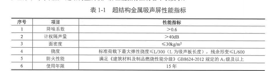 3.1.4.2其他要求如下:1、金属吸声屏应使用厂家生产的成品板。表面采用静电粉末喷涂(哑光),静电粉末喷涂工艺应包含前处理工序,最小局部膜厚>40μm。要求表面光洁,无划痕、皱皮、流坠、气泡、变色、和色泽不均等缺陷。超结构金属吸声屏性能指标应符下表要求。